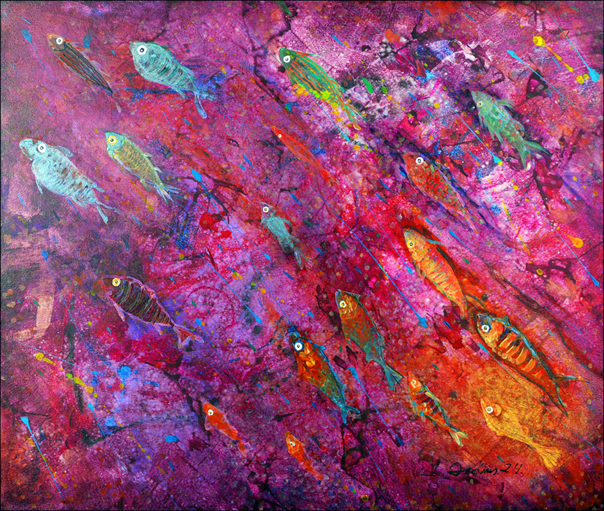 Unos peces de colores irreales nadan buscando la superficie en un mar diluido de sangre, que es la víspera del sombrío futuro de las poblaciones oceánicas sometidas a la sobrepesca y a la contaminación. Al final quedaremos con un mar donde los desechos desplazan a la fauna y flotan o se esconden en las profundidades, matando peces, crustáceos, moluscos, cetáceos y otros mamíferos marinos. Con el tiempo tendremos que conformarnos con comer el ubicuo plástico de nuestros mares.