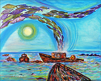 En mis sueños de infancia, repaso los momentos de pesca con mi padre en el puerto de Corinto. Siendo niño siempre quise que los peces, emergiendo de las aguas, pudieran volar. Y aunque hay algunos peces voladores en otros sitios, yo nunca los vi. Pero los seguí soñando, hasta que pude hacerlos realidad en mis lienzos.