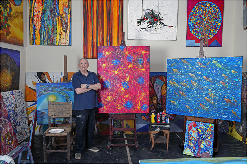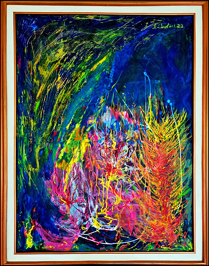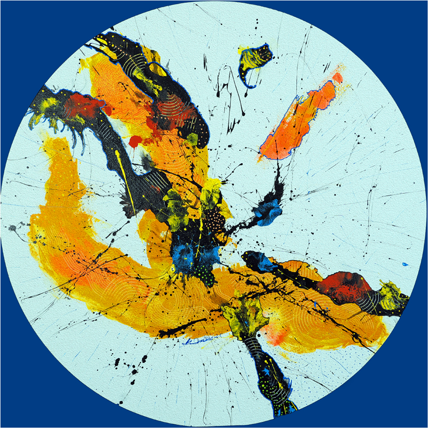Quise que la composición fuera explosiva y orgánica: chorros, manchas y filamentos que se entrelazan en un movimiento incesante, como si el lienzo fuese testigo de un estallido primordial.